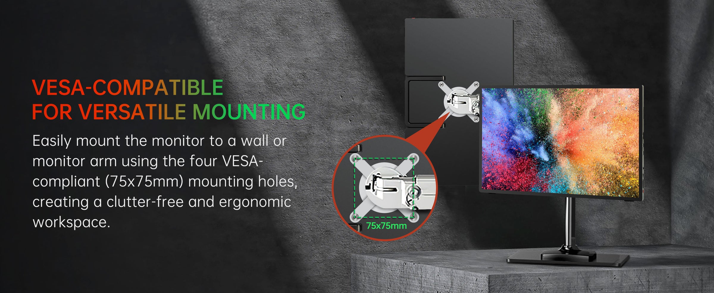 With four VESA screw holes, it offers versatile mounting options for your setup. The built-in adjustable stand allows for flexible positioning, ensuring comfort whether you're working, gaming, or streaming. This premium monitor is designed to complement your lifestyle with its seamless blend of style, performance, and portability.