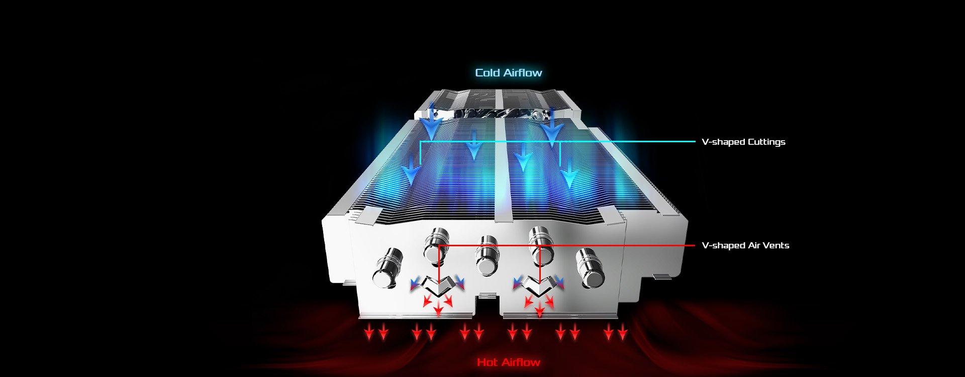 獨家 V 形切角和 V 形氣孔,引導氣流更規律、更快速地流動,提高冷卻效率。
