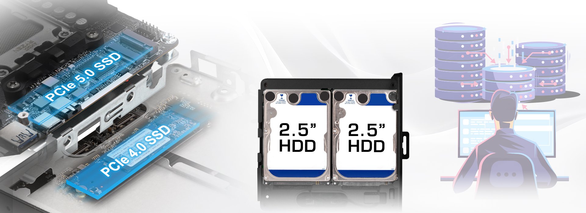 配備雙 M.2 插槽 (PCIe Gen5 x4 和 Gen4 x4) 與雙 SATA 6Gb/s 插槽,支援最多四個儲存裝置。M.2 與 SATA 皆支援 RAID 0 提升速度及 RAID 1 提供資料備援,成為多功能且可靠的儲存解決方案。