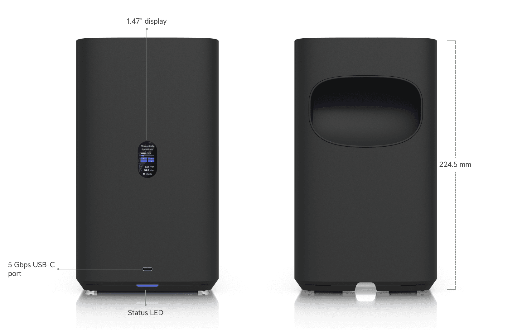 UniFi Network Attached Storage with (4) 2.5/3.5" HDD bays, (2) M.2 NVMe SSD cache slots, 2.5 GbE networking, USB-C connectivity, and an included PoE+++ adapter, all in a compact footprint.