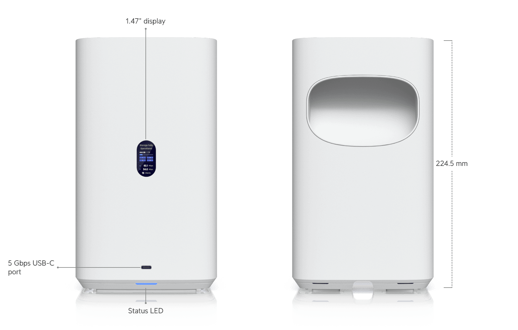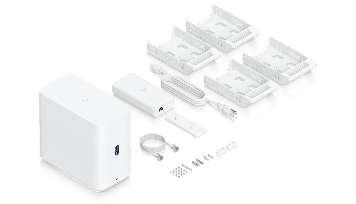 UniFi Network Attached Storage with (4) 2.5/3.5" HDD bays, (2) M.2 NVMe SSD cache slots, 2.5 GbE networking, USB-C connectivity, and an included PoE+++ adapter, all in a compact footprint.