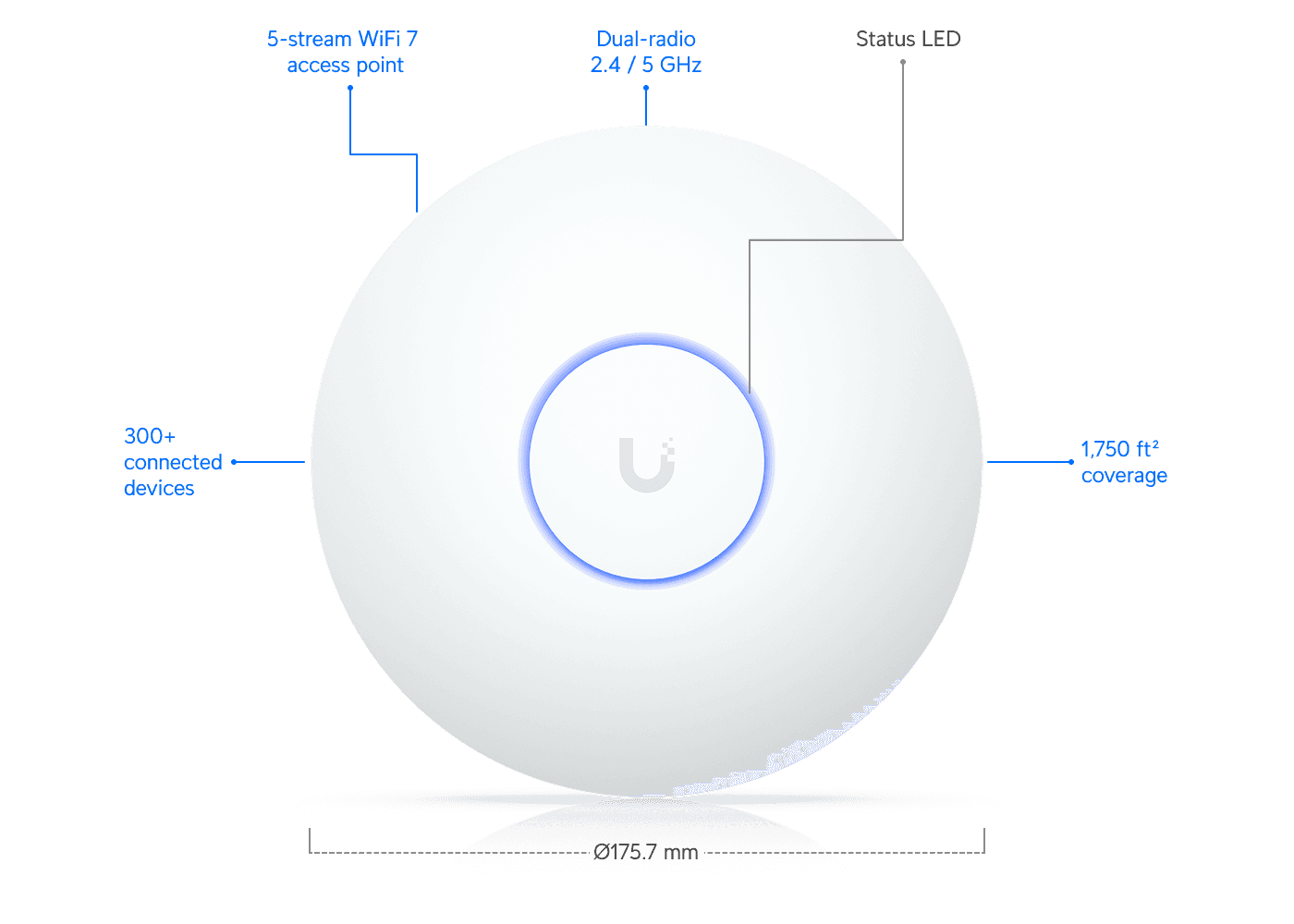 Compact, ceiling-mount WiFi 7 AP with 5 spatial streams and extended signal range.