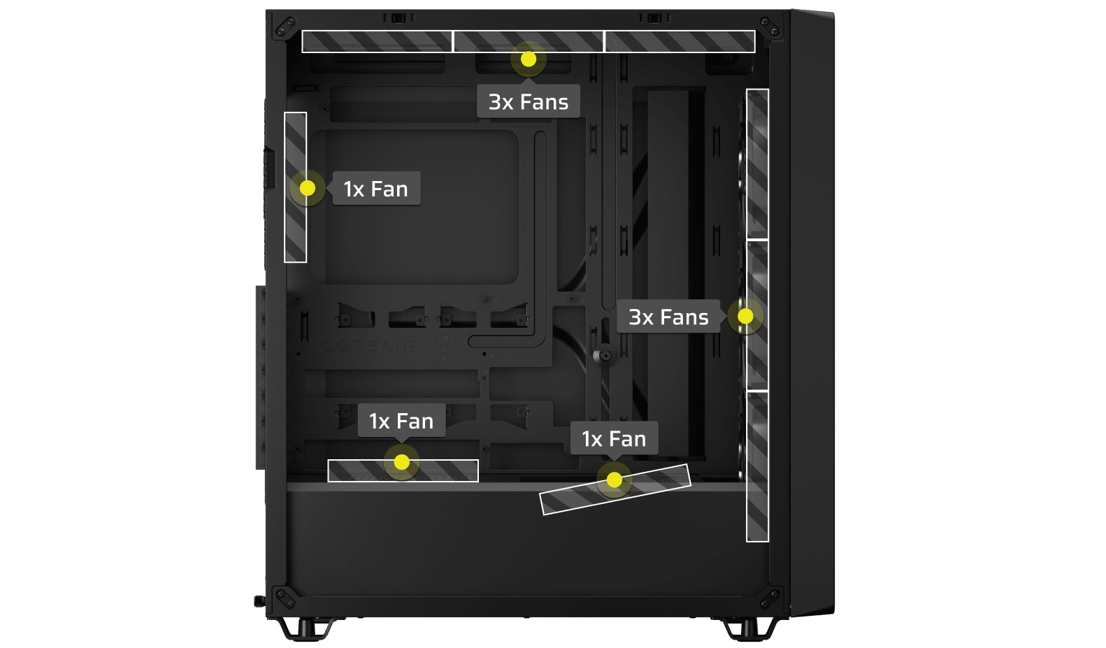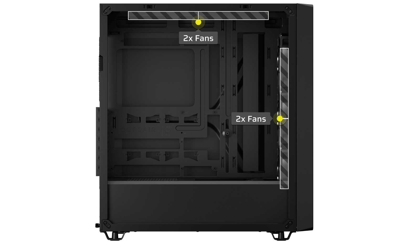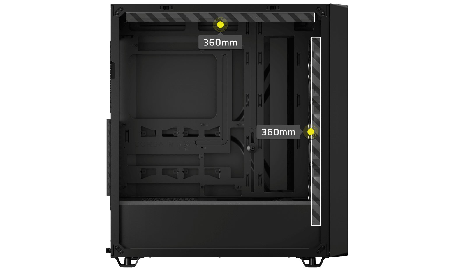 The CORSAIR 3200D is made to keep the hottest components cool with 2x 360mm radiator mounting locations and fan mounts throughout the chassis for continuous airflow.