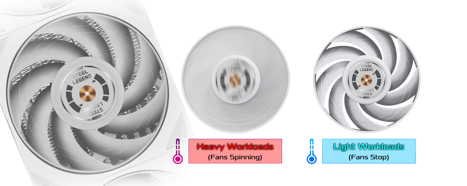 Fan stops completely under low load for absolute silence and extended lifespan.